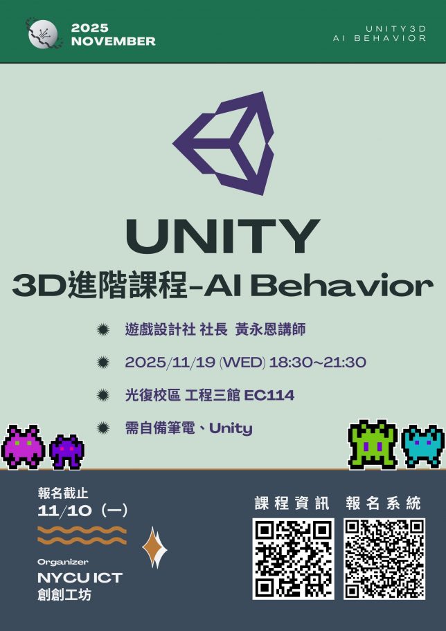 Unity3D進階課程-AI Behavior | 1. 介紹 Navigation2.0 與 Boids 動物群眾模擬基本概念 2. 承接第一堂製作之NPC、使其自動化導航路線 3. 設計動物類的群眾NPC、使其自然地於場景行動 4. 其他進階內容(例如ML Agent) | 0.25hr | 1hr | 0.25hr | – |
