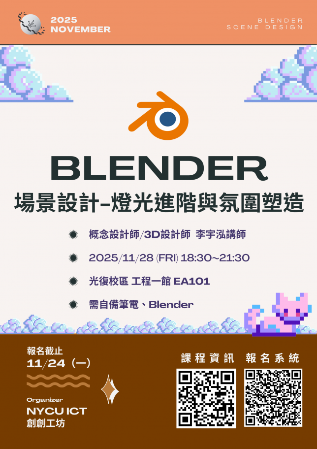 Blender3D 場景設計-燈光進階 | 1. 介紹Eevee與 Cycles等不同渲染器 2. 比較兩者於光影表現上的差異 3. 設計兩種不同氛圍的燈光方案 | 0.25hr | 1hr | 0.25hr | – |