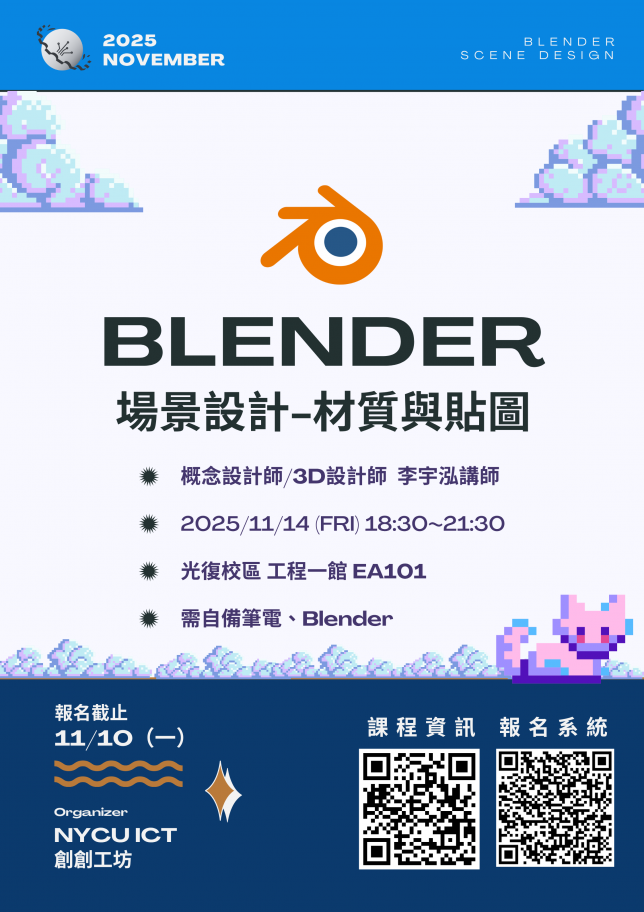 Blender3D 場景設計-場景設計 | 1. 介紹UV概念 2. 實作UV展開 | 0.25hr | 1hr | 0.25hr | – |